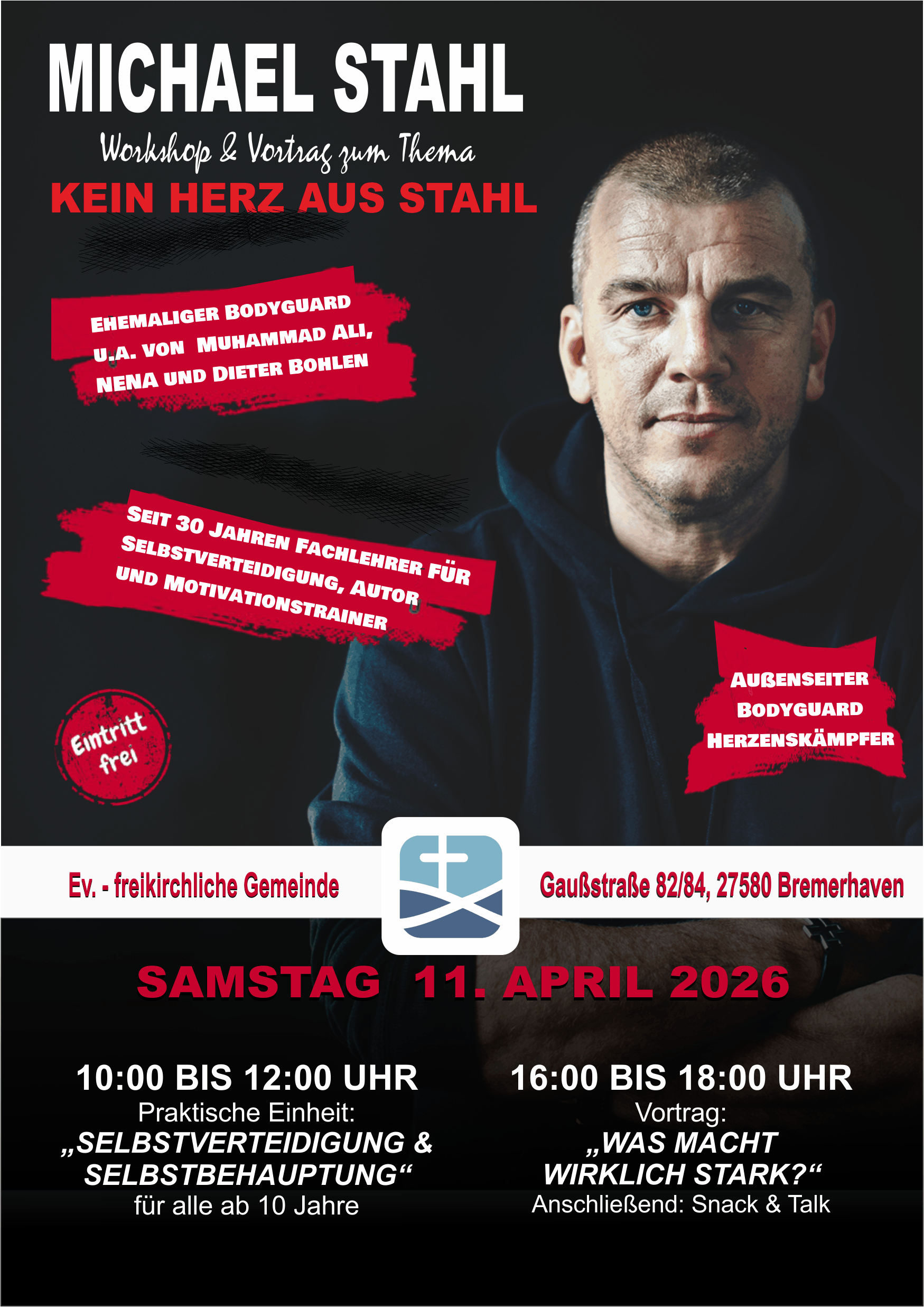 Am Nachmittag lädt die Gemeinde der Erlöserkirche um 16 Uhr zu einem bewegenden Vortrag von Michael Stahl unter dem Titel „Was uns wirklich stark macht“ ein. Darin geht es um die Frage, was echte Stärke ausmacht – weit über körperliche Kraft hinaus. Ausgehend von seiner eigenen Lebensgeschichte berichtet er von Herausforderungen, persönlichen Krisen und prägenden Erfahrungen und zeigt auf, wie innere Stärke, Versöhnung und neue Perspektiven wachsen können.